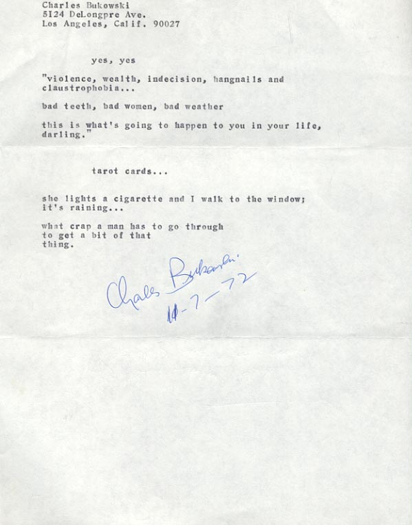 Al jaren lang ben ik een groot liefhebber en bewonderaar van het werk van Charles Bukowski. In eerste instantie vooral van zijn proza maar de laatste jaren steeds meer ook van zijn poëzie. Op het internet kwam ik de website http://bukowski.net/ tegen. Een website vol schatten als het om Charles Bukowski gaat. Niet alleen ontzettend veel informatie over hemzelf en een mooie tijdlijn van zijn leven maar vooral prachtige afbeeldingen van originele manuscripten en gedichten.