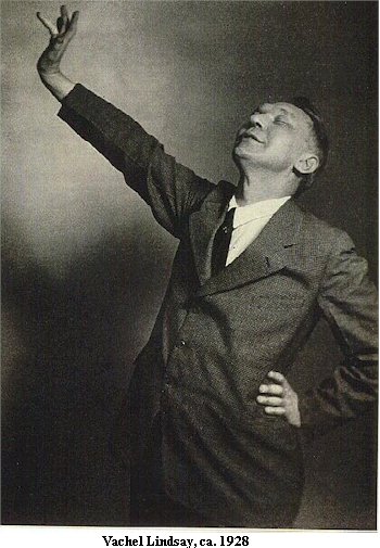Nicholas Vachel Lindsay (1879 – 1931) was een Amerikaans dichter die wel gezien wordt als de oprichter of bedenker van de ‘Singing poetry’ waarbij gedichten worden gezongen of gescandeerd. In die zin kun je hem beschouwen als een voorloper van de slam poëzie en/of spoken word. Hoewel zijn ouders wilde dat hij dokter zou worden dacht Lindsay daar anders over. Hij studeerde Pen & Ink aan de New York School of Art. In New York groeide zijn liefde voor poëzie. Hij probeerde zijn gedichten, die hij zelf stencilde, op straat aan de man te brengen. Daar begon hij ook met een soort ruilhandel: Een gedicht voor een stuk brood.