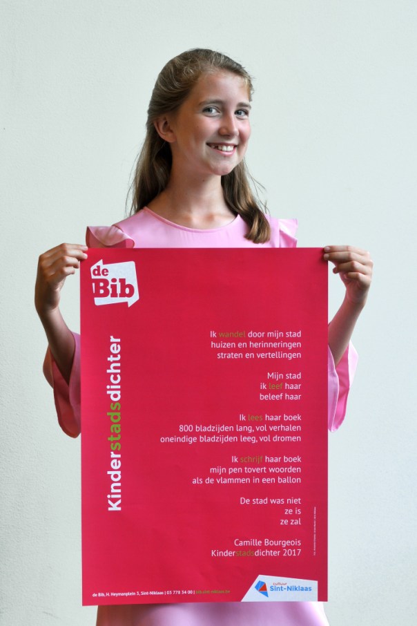 De kinderstadsdichter schrijft jaarlijks onder begeleiding van een jeugdauteur een aantal gedichten die belangrijke gebeurtenissen in de stad als onderwerp hebben. De gedichten worden voordgedragen tijdens de jaarlijkse vredesfeesten en op flyers gedrukt en verspreid. In 2015 was de toen 11 jarige Camille Wellens kinderstadsdichter, in 2016 de 14 jarige Eefje Brandt en in 2017 werd de 13-jarige Camille Bourgeois gekozen tot stadsdichter. Haar winnende gedicht heeft geen titel maar gaat over de stad Sint-Niklaas. Ik weet dat in Nederland Groningen, Haren en Eemsmond een kinderdichter hebben maar misschien is het een goed idee dit breder te laten landen.