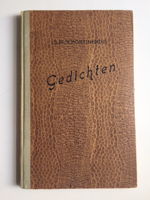 Een enkele keer kom ik in een kringloopwinkel of op een rommelmarkt een dichtbundel tegen waar ik, puur en alleen om de kaft, al blij van word. De bundel ‘Gedichten’ van S.W. Schortinghuis is zo’n bundel. Een ouderwets, bijna schoolschriftachtige omslag, in een soort bruin nep-leer maar gewoon van papier.