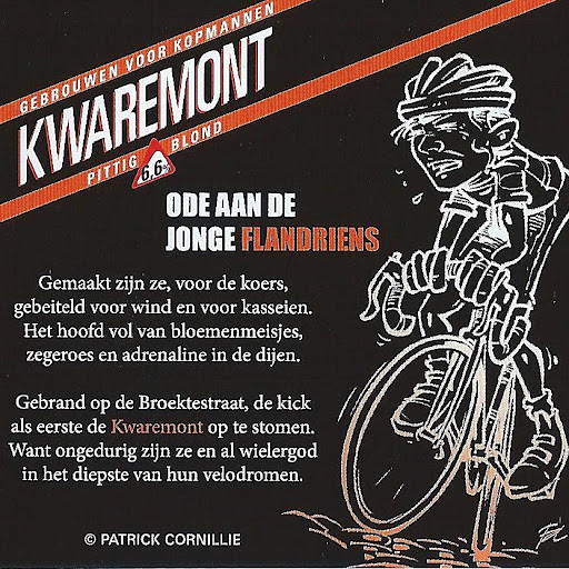 Cornillie debuteerde in 1989 met de bundel ‘De draagwijdte van het heden’ en schreef sindsdien vele dichtbundels, fietsgidsen, sportboeken en proza. Zijn werk werd verschillende malen onderscheiden, zo kreeg hij onder andere poëzieprijzen in Halle, Harelbeke, Keerbergen en Ronse, de Yang Poëzieprijs en de Julia Tulkens Poëzieprijs. Het gedicht van Patrick Cornillie op de bierfles van Kwaremont lees je hieronder.