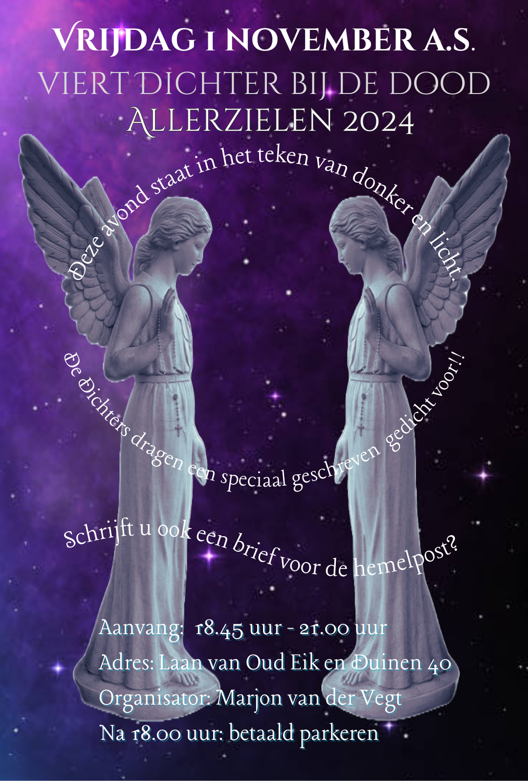 Ik zal daar ook aanwezig zijn en mijn gedicht voordragen. Andere dichters zijn bijvoorbeeld Karen de Boer en Simon Mulder. Ook dit jaar wordt er een bundeltje gemaakt van de gedichten van de dichters die meedoen. Dit bundeltjes wordt gratis uitgereikt aan bezoekers van Dichter bij de Dood 2024.