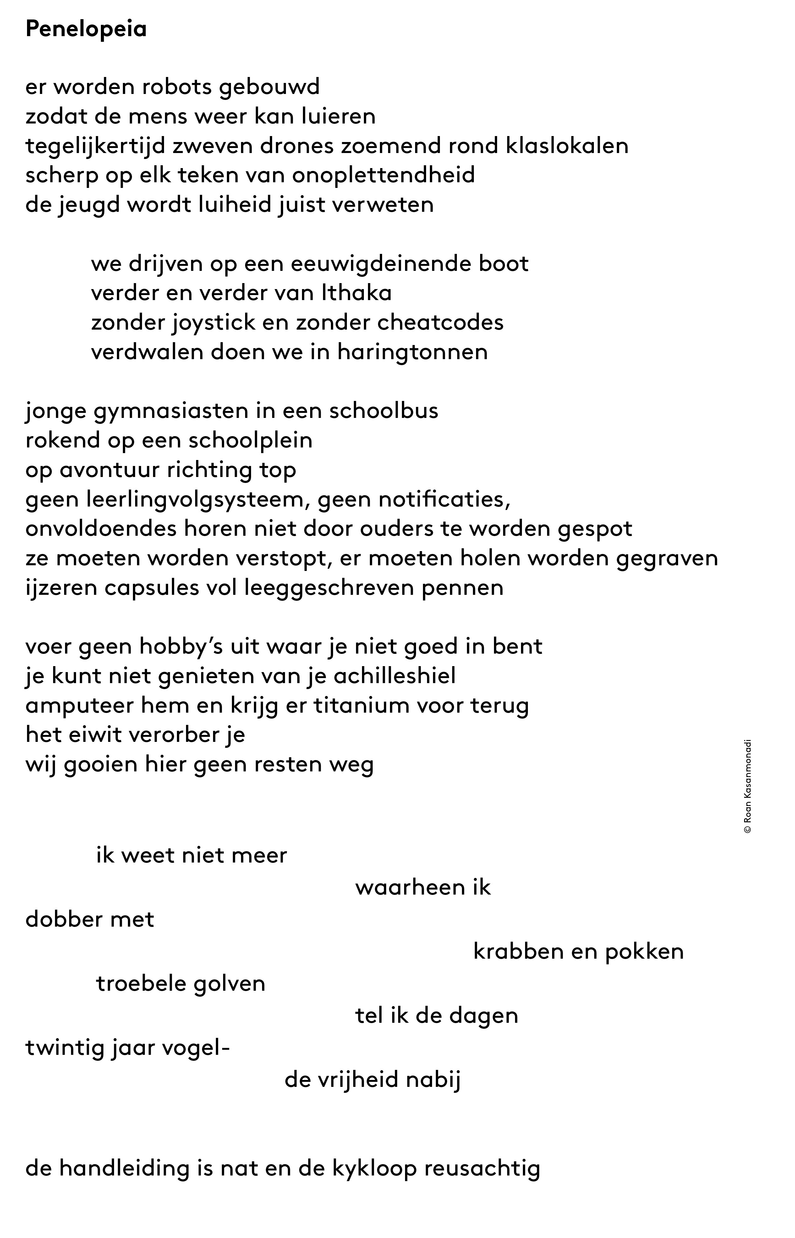 Roan trad op bij Poetry International, Mensen Zeggen Dingen en op de Nacht van de Poëzie. Zij debuutbundel ‘Vuurbloem’ werd genomineerd voor de C. Buddingh’-prijs in 2025. En naast al deze bezigheden is hij ook nog eens redactielid van De Revisor. Op de website van deburen.eu las ik een gedicht van zijn hand getiteld ‘Penelopeia’ dat hij schreef als deelnemer aan de schrijfresidentie van deBuren in 2024 waarbij hem gevraagd werd zich te laten inspireren door het Olympisch motto ‘harder, sterker, sneller-samen? In dit gedicht brengt hij de Griekse mythologie en scholieren samen over de druk aan verwachtingen te voldoen. Het gedicht staat ook in zijn debuutbundel.