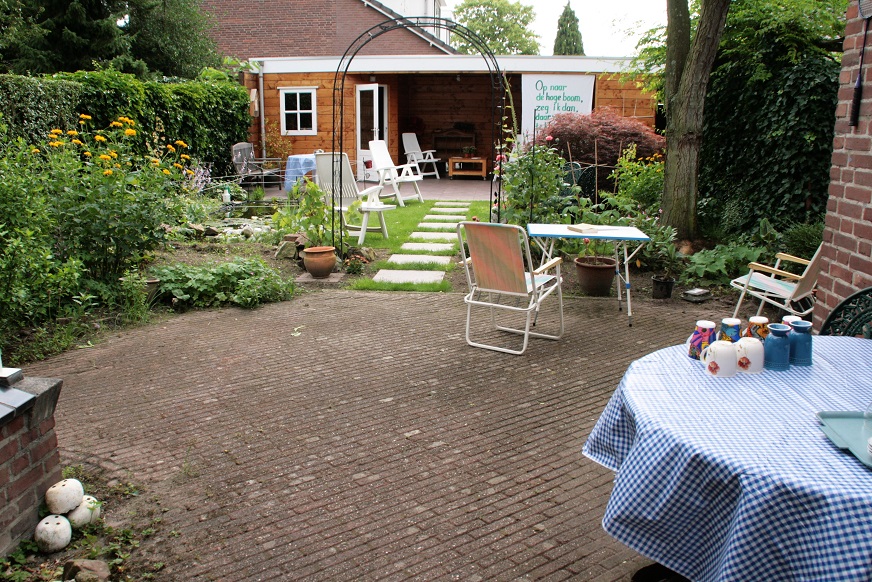Overigens toen ik op het wereld wijde Interweb op zoek was naar haar poëziehuisje kwam ik nog een ander poëziehuisje tegen Koog Zaandijk Westzaan. Iets dergelijks maar wel anders (vanuit een doopsgezinde hoek). Terug naar De Rode Poort. Het poëziehuisje is een soort inloop minibieb (afschuwelijk woord dat de lading niet dekt, ik zou zeggen miniboekenkastje), echter de bundels mogen niet mee naar huis genomen worden. Je kunt gebruik maken van de zitjes in de tuin, om er te gaan zitten lezen, maar er kan ook geschreven worden. Voor dichters is er de mogelijkheid om een gedicht of een voordracht uit te proberen. Als er feedback gewenst is dan kan die gegeven worden. Er staat altijd koffie en thee klaar. De tuin ziet er uitnodigend uit en is ruim. Bij wat slechter weer is er een overkapping en natuurlijk is er het huisje. Zelfs naar binnen gaan behoort tot de mogelijkheden. Kortom een oase van poëzie daar in Rosmalen.