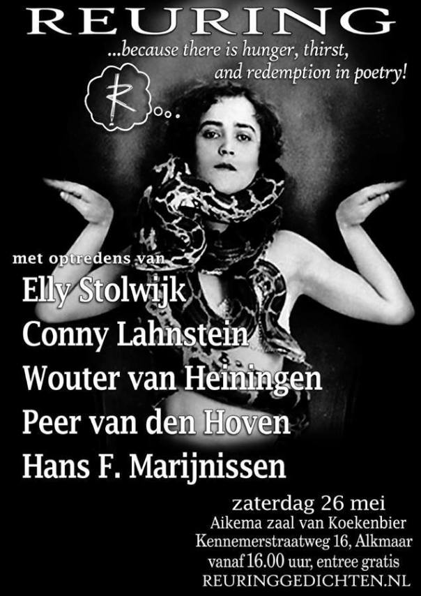 Op zaterdag 26 mei zal ik voordragen op het sympathieke poëziepodium Reuring van Alja Spaan in Alkmaar. Hans Marijnissen presenteert zijn nieuwe bundel Honger, Dorst & Verlossing, verder zullen optreden de dichters Elly Stolwijk, Peer van den Hoven en Conny Lahnstein.