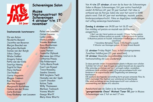 Tussen 4 en 27 oktober wordt in Muzee de Scheveningse Salon georganiseerd door de stichting Art & Jazz. Art & Jazz bestaat dit jaar 10 jaar en dat wordt gevierd. Vanmiddag tussen 14.00 en 17.00 uur is er een middag vol poëzie en muziek.