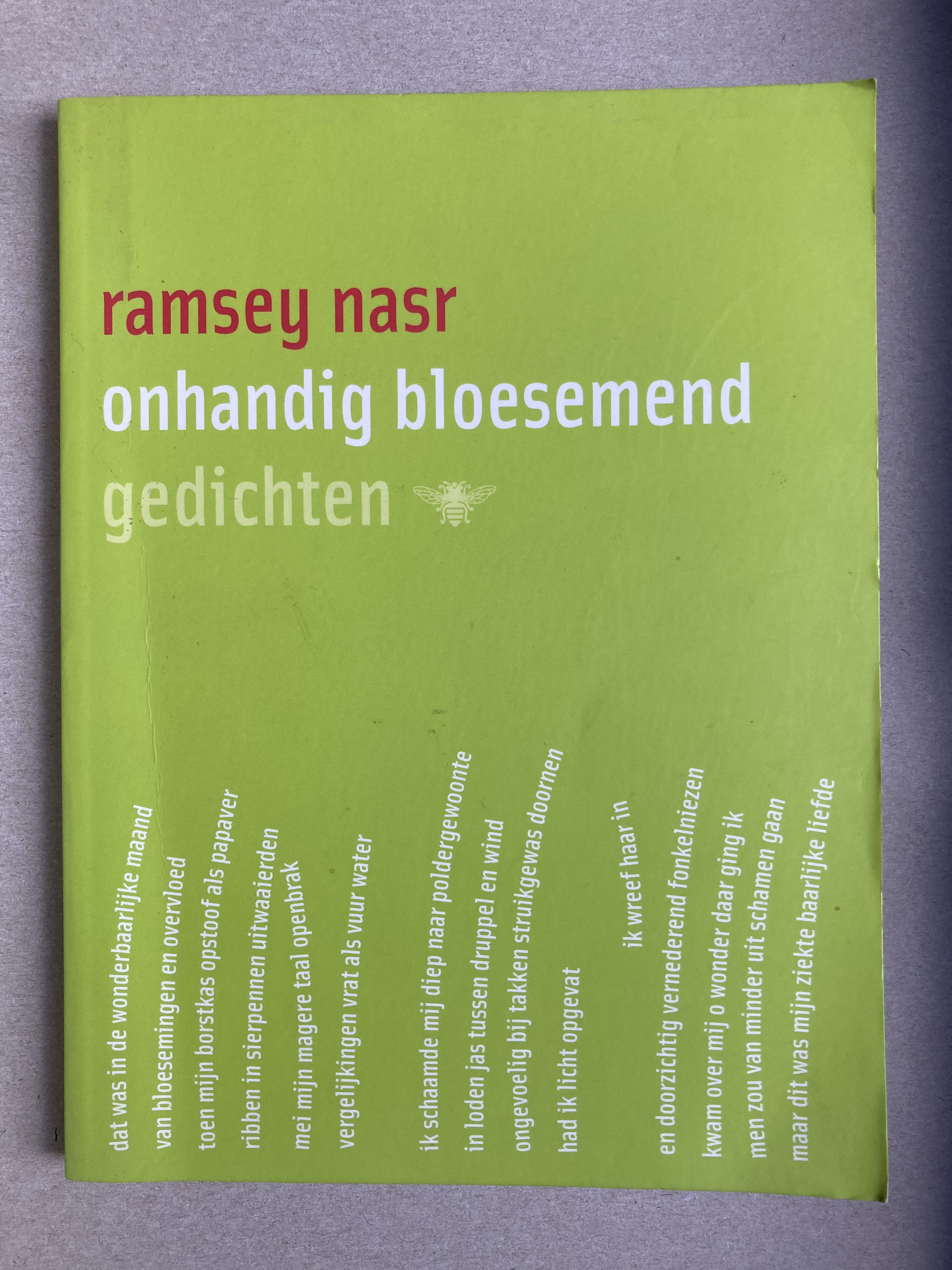 Onlangs kocht ik de bundel ‘onhandig bloesemend’ uit 2004 van hem en opnieuw werd ik niet teleurgesteld. Een bundel vol kleurrijk taalgebruik zoals je van Nasr mag verwachten, onderwerpen die heel actueel aandoen (‘het complot’), gedichten over wetenschap, Frederik die in verschillende gedichten voorkomt en een hoofdstuk Wintersonate met drie lange proza-achtige gedichten.