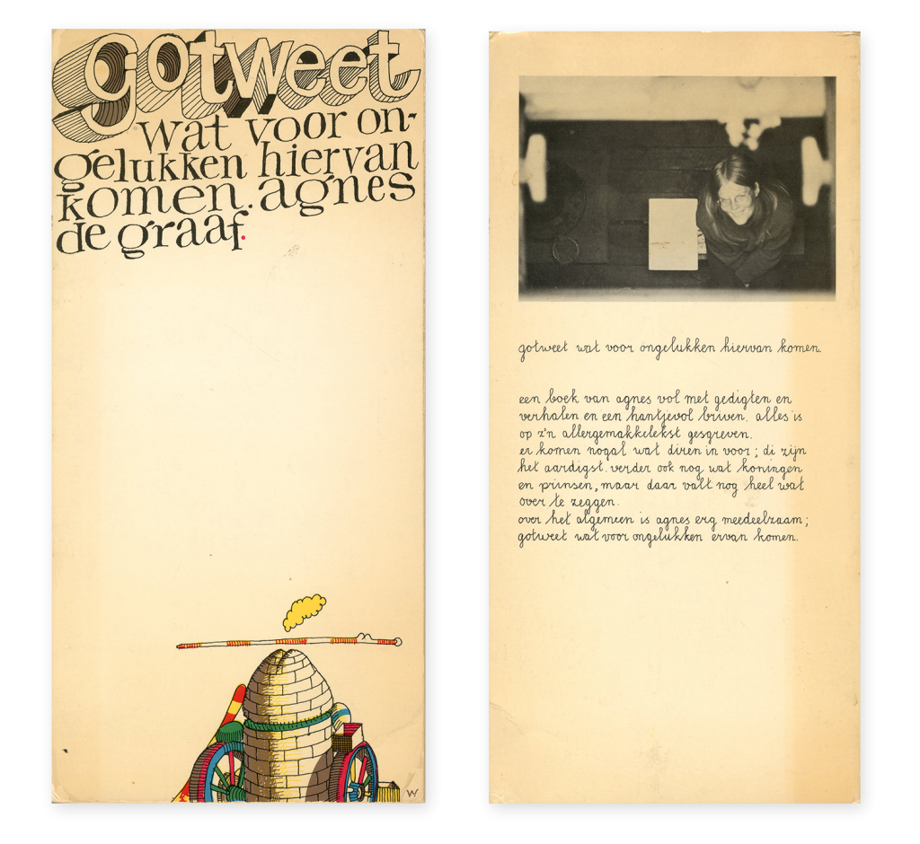 Omdat ik een dergelijke rubriek al jaar en dag op dit blog voer was ik meteen geïnteresseerd. Agnes de Graaf haar debuut ‘Gotweet wat voor ongelukken hiervan komen’ uit 1970 werd zeer wisselend ontvangen. Ze bediende zich in haar eerste en enige bundel van een nogal afwijkend vocabulaire dat “ekspres” barstte van de fouten. Haar gedichten werden geschreven in een taal die geen rekening houdt met grammatica, ze zijn opgeschreven zoals ze klinken. Nu was dat in die tijd niet heel ongewoon, ook dichter en schrijver Remco Campert bediende zich in 1968 in zijn roman ‘Tjeempie! of Liesje in luiletterland’ ook van fonetische alternatieve spelling van woorden.