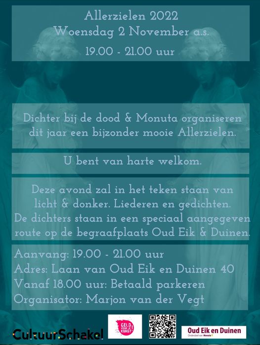 Vanavond is het alweer zover, de 10e editie van Dichter bij de Dood, een prachtig project waarbij dichters voordragen op de begraafplaats Oud Eik en Duinen in Den Haag. Van origine werd deze activiteit georganiseerd op 2 november (Allerzielen wanneer men de gestorvenen herdenkt) maar door interne verschuivingen bij de begraafplaats is dat sinds 2 jaar nu op Allerheiligen, op 1 november. Omdat deze activiteit in het leven geroepen is om de doden te herdenken en stil te staan bij de dood als onlosmakelijk element van het leven hangen we niet zo sterk aan deze datumverwisseling al is het wel jammer.