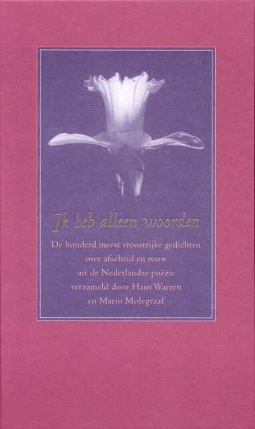 Ik hou enorm van poëzie, van dichters en van hun dichtbundels. En daarnaast hou ik heel veel van themabundels. Ik heb er inmiddels al vele over verschillende thema’s. Een van die themabundels is ‘Ik heb alleen woorden’ uit 1998, de honderd meest troostrijke gedichten over afscheid en rouw uit de Nederlandse poëzie. Verzameld door Hans Warren en Mario Molegraaf. Op de achterflap van de bundel staat te lezen: Er zijn eindeloos veel soorten van verdriet- maar ook eindeloos veel soorten troost. En dat is natuurlijk ook zo. Verdriet en troost zijn persoonlijke belevingen en hoe we daar mee omgaan, wat we als verdriet of troost ervaren is voor elk van ons anders.