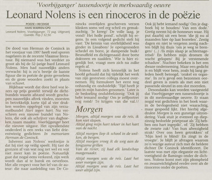 In 2010 verscheen zijn dichtbundel ‘Neem me mee, zei de hond’. Jurre van den Berg schreef in zijn recensie op Tzum in 2010 over de gedichten in ‘Neem me mee zei de hond’: “Uit de gedichten spreekt permanente interesse in de onbekende Ander. Wie zijn de voorbijgangers in mijn wereld? In het verloop van de bundel levert dit steeds grimmiger gedichten op, waar ondanks de reekstitel ‘Dood, afwezige’ de dood nooit ver weg is, en de wereld blijft bevreemden.” Dat laatste is zeker van toepassing op het bevreemdende gedicht ‘Hoe Elvis de abstractie in de popmuziek introduceerde’.