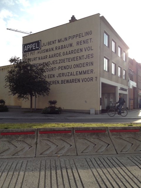Afgelopen dagen was ik in de westhoek van Vlaanderen, Tijdens een bezoek aan Kortrijk viel me een enorme muurschildering op met een bijzonder gedicht met als titel Appel.