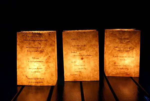In de categorie Gedichten op vreemde plekken vandaag het gedicht op de papieren zak van kunstenares Mine Stemkens. Niet zo maar op een papieren zak maar op een zak waar je een waxinelichtje in kunt zetten zodat de zak van binnen uit wordt verlicht en het gedicht op de buitenkant zichtbaar wordt.