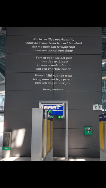 De Rotterdamse dichterCornelis Bastiaan Vaandrager (1935 – 1992) schreef het gedicht ‘Nederlandse spoorwegen’ en dit gedicht staat , in de kleuren van de NS, op een muurtje naast een voordeur in Leiden aan de Moorsweg.