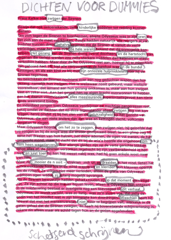Al eerder schreef ik hier over stiftgedichten, of readymades. Het recept: men neme een bestaande tekst, markeer de woorden die je wilt gebruiken of bekras of maak zwart alle woorden die je niet wil gebruiken. Wat je over houdt zijn bestaande woorden uit een tekst die een nieuw gedicht vormen. Nu kwam ik onlangs een aantal voorbeelden van stiftgedichten tegen (of blackout poetry zoals ze ook wel genoemd worden) die nog een stapje verder gaan. Het krassen en markeren is hier vervangen door kunstzinnige vormen of bestaande vormen die het stiftgedicht versterken.