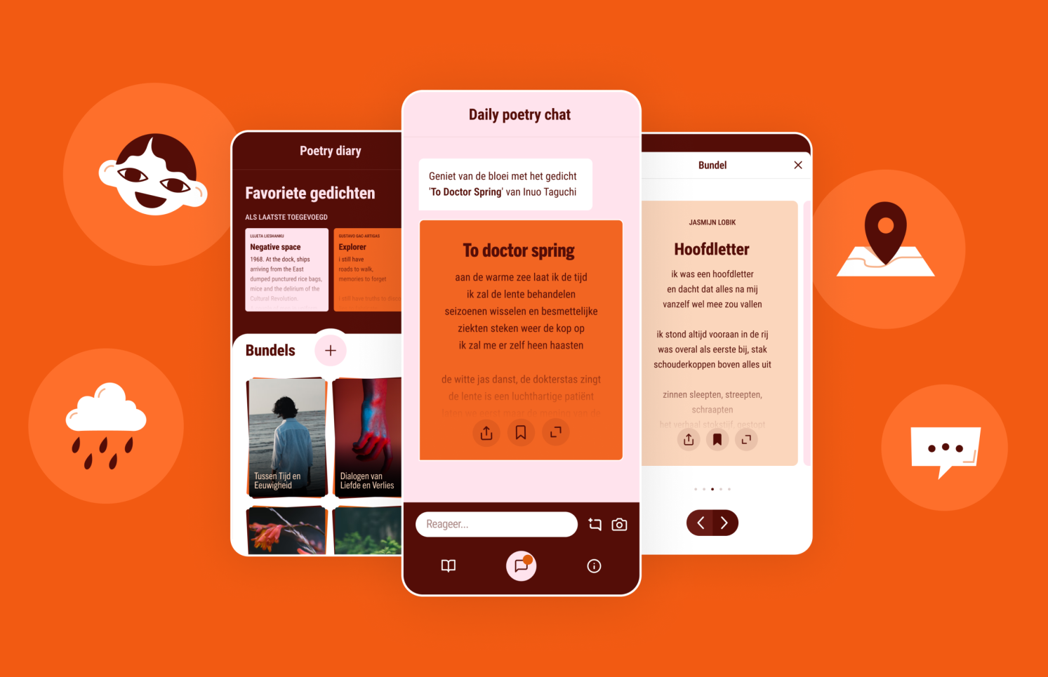 Je kunt in de chat kiezen om gedichten in thema’s te kiezen die de chat je voorlegt of zelf je thema’s kiezen. De taal van de app is niet de taal van (veel van de) gedichten, de gedichten zijn handmatig vertaald en ook beschikbaar in de oorspronkelijke taal. Daarnaast kun je je gedichten opslaan in gepersonaliseerde bundels die met je smaak en stemming meegroeien, en je kunt samen met vrienden een bundel samen stellen of je gedichten delen met vrienden. Kortom, op naar je app store en downloaden maar voor elke dag iets nieuws wat bij je stemming of interesse past.